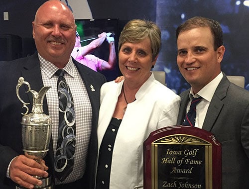 Rick poses with his wife Sherry and Zach Johnson following Zach’s induction into the Iowa Golf Hall of Fame in 2016.