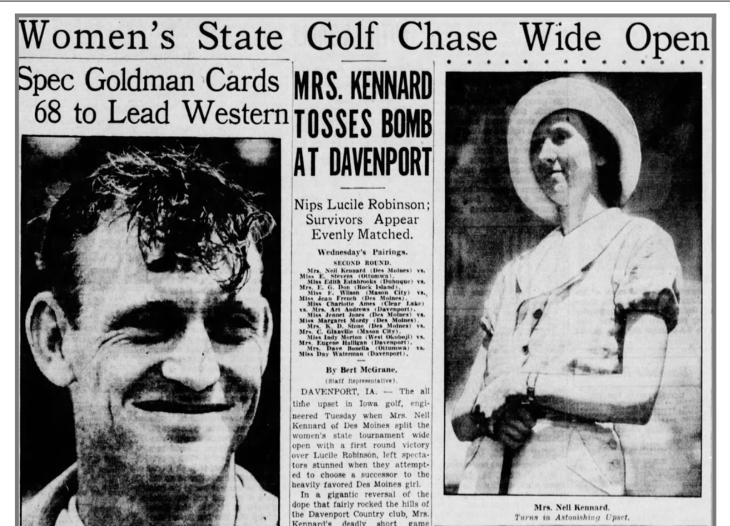 McGrane sat down and hammered this out on his typewriter: “The all-time upset in Iowa golf, engineered Tuesday when Mrs. Neil Kennard of Des Moines split the women’s state tournament wide open with a first-round victory over Lucile Robinson, left spectators stunned when they attempted to choose a successor to the heavily favored Des Moines girl. In a gigantic reversal of the dope that fairly rocked the hills of the Davenport Country Club, Mrs. Kennard’s deadly short game shoved Miss Robinson into the discard with a 1 up victory and opened a free-for-all struggle for the championship held for four straight years by the dethroned titleholder.”