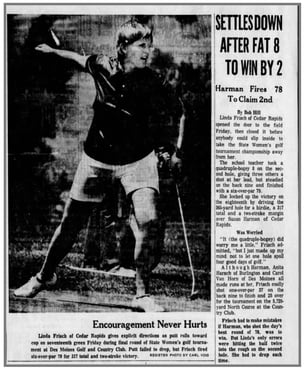 Linda Frisch of Cedar Rapids knew all about taking a break from golf. She had taken off three consecutive summers leading up to the 1973 Iowa Women’s Amateur when working at a summer camp. Even with the break, Frisch never lost her competitive edge and ultimately claimed a two-stroke victory over fellow Cedar Rapids resident Sue Harmon.
