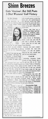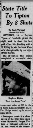 After earning the qualifying medalist spot with a 75, Tipton followed with rounds of 79, 76, 77 to post 307. The self-made player unleashed tee shots of up to 250 yards as spectators and fellow competitors could do nothing but watch in awe, and perhaps envy. Defending champion Corkey Nydle told reporters, “I think she surpasses any woman golfer we’ve had in Iowa for a long time”. High praise from someone like Nydle who at the time had racked up two victories at the top event. Linda Schelldorf and Jacque Fladoos finished second and third, respectively, to round out the all-teenage top three.