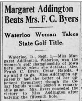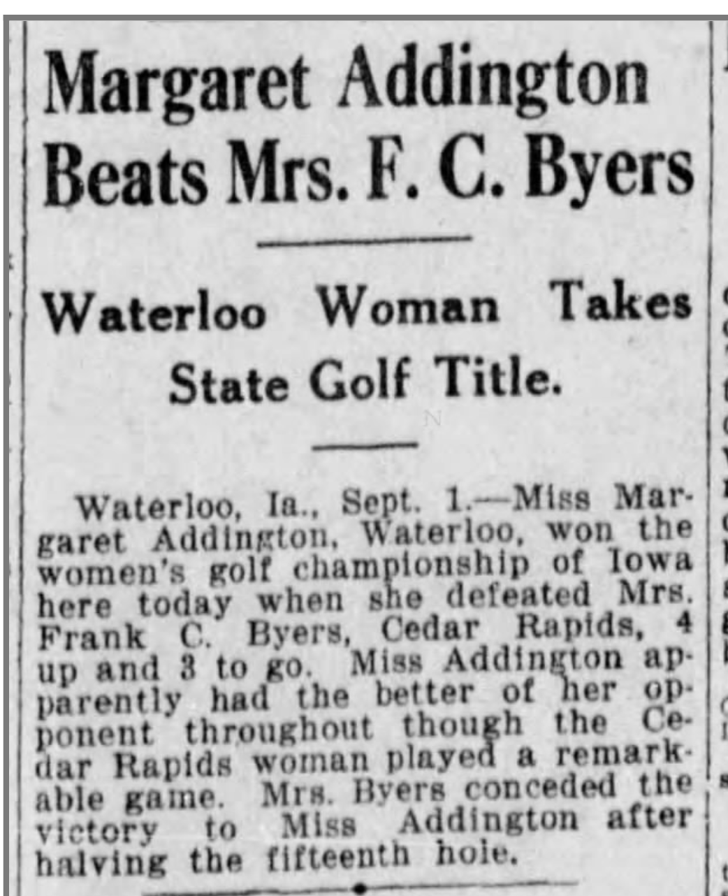 After starting the match tied through three, Addington would reel off six straight wins on holes four through nine to take a commanding lead into the back nine. Byers would cut into the deficit with a par on ten but it wouldn’t be enough as Addington quickly won the 11th getting back to a six-up advantage. After tying the 12th, Byers sank an eight-footer for birdie on 13 to keep her championship hopes alive. It wouldn’t be enough though as the two tied the 15th and final hole, etching Addington as the first in a long list of Iowa Women’s Amateur champions. Her triumph undoubtedly laid the foundation for future generations of female golfers to excel on the course.