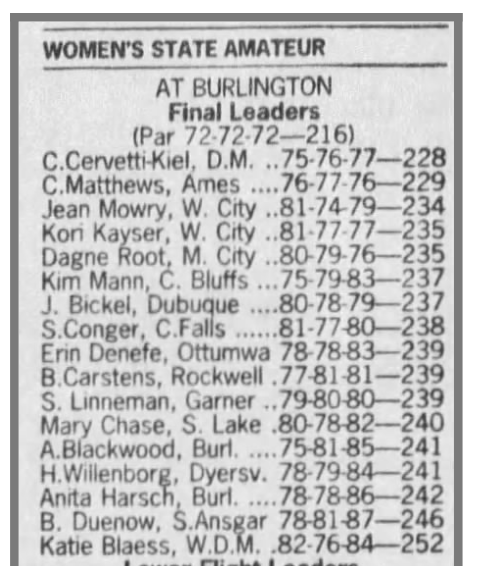 Her win at Finkbine Golf Course solidified her status as a formidable force in Iowa’s golfing community. More impressive than winning her first title in her first attempt was the list of past and future Iowa Women’s Amateur champions who filled the final leaderboard, including Jenny Heinz, Patricia Martinson, Sarah Gilbert, and Jennie Arseneault.