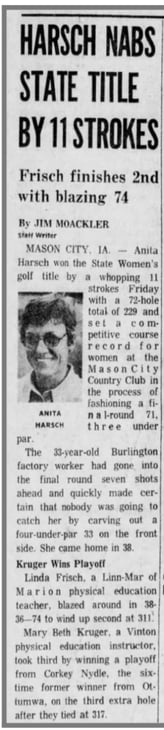 With the last name of Harsh, it only made sense that Burlington’s Anita Harsh toppled the field at the 1975 Iowa Women’s Amateur. Her 72-hole total of 229 was a staggering 11 shots better than runner-up Linda Frisch. Opening with rounds of 75 and 73, Harsch left little doubt that she was the player to beat. At the halfway point of the championship, Mason City Country Club had yielded just eight rounds under 80.