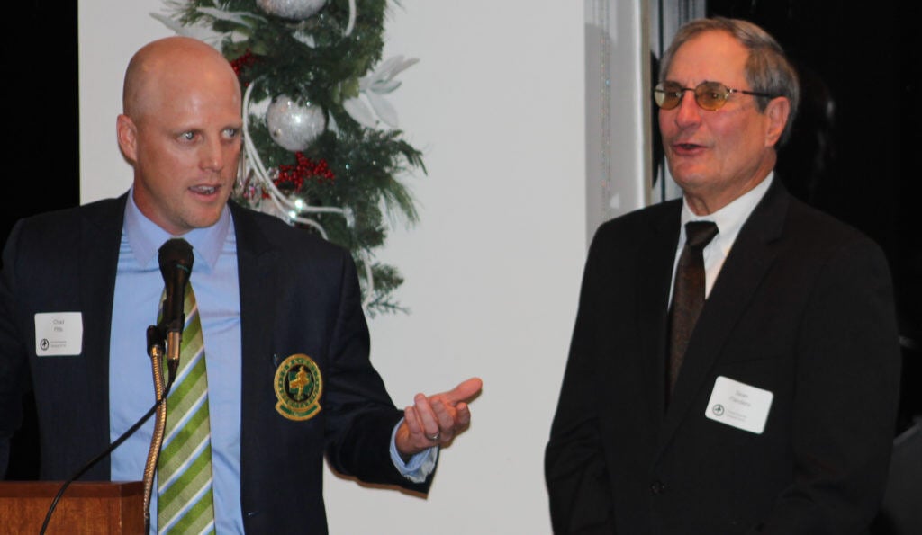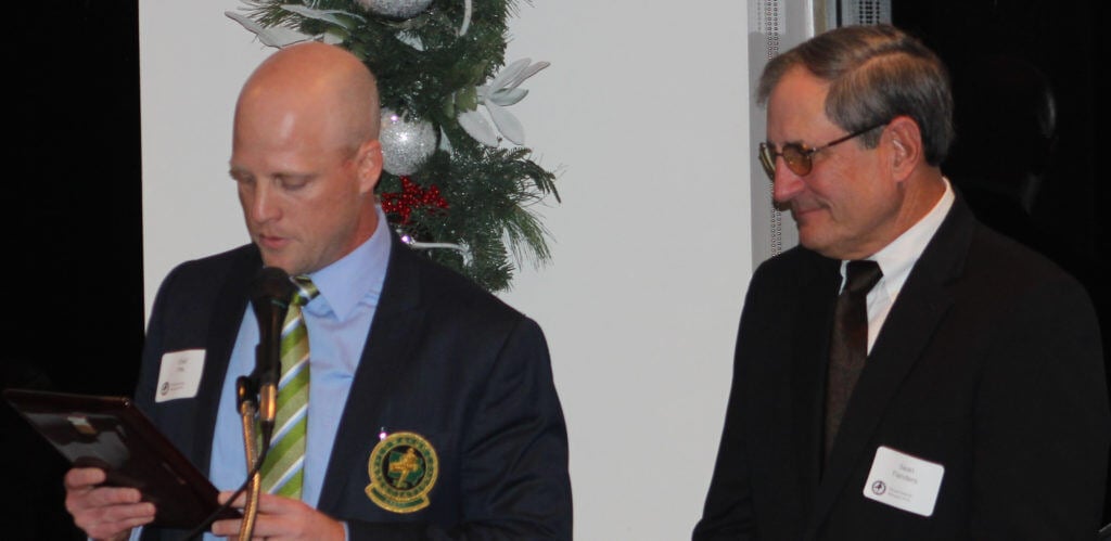 IGA Executive Director Chad Pitts (left) announces to the audience that the IGA Volunteer of the Year will be named after Sean Flanders (right).