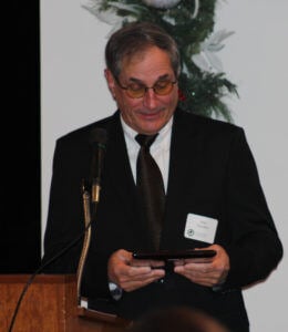 Sean Flanders accepts a plaque signifying the IGA Volunteer of the Year will named in his honor.