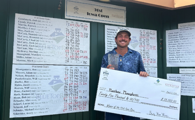 Matthew Meneghetti (above) of Schererville, Indiana the 91st Iowa Open Champion presented by Riverside Casino and Golf Resort on Sunday, August 4 at Blue Top Ridge at Riverside. Meneghetti’s 3-day total was 71-65-69=205, 11-under-par. Meneghetti’s final round included birdies on holes 3, 4, 7, 9 and 17 including bogeys on holes 5 and 18. This is Meneghetti’s second Iowa Open having won in 2022.