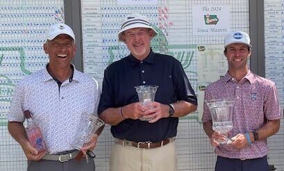 Des Moines’ Dave Gaer (center in photo) won again this season in the Super Senior Division. Gaer carded rounds of 78 (+6), 71 (-1), and 73 (+1) to win by an impressive 13 strokes. Runner-up was Bob Brooks 235 (+19) and coming in third was Sam Horstein 237 (+21).