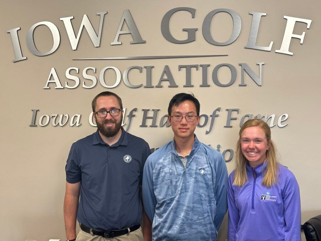 From left – 2023 P.J. Boatwright Interns for the Iowa Golf Association Gavin Matthias, Derek Peng and Paige Hoffman.