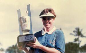 Barb is all smiles as she hoists the trophy for capturing the 1996 Cup Noodles Hawaiian Ladies Open.
