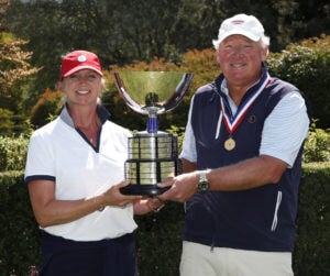 Iowa’s Gene Elliott poses with his winners medal, trophy and wife Dalena following victory in the R&A Senior Amateur Championship at Ganton Golf Club in Scarborough, England. (Photo by Jan Kruger/R&A)